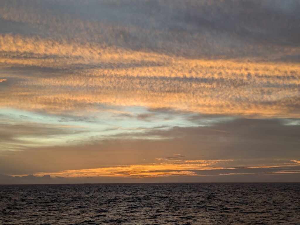 陸上で見るそれとは違い、どこまでも続く水平線のかなたに沈みゆく太陽…(太陽は雲に隠れ…泣)。